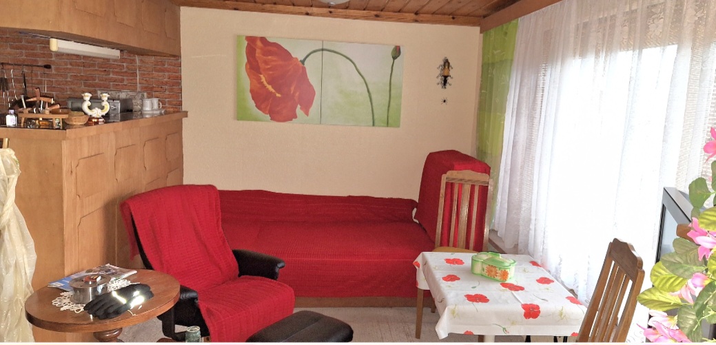 Wohnzimmer mit Schlafcouch und integrierter Küche
